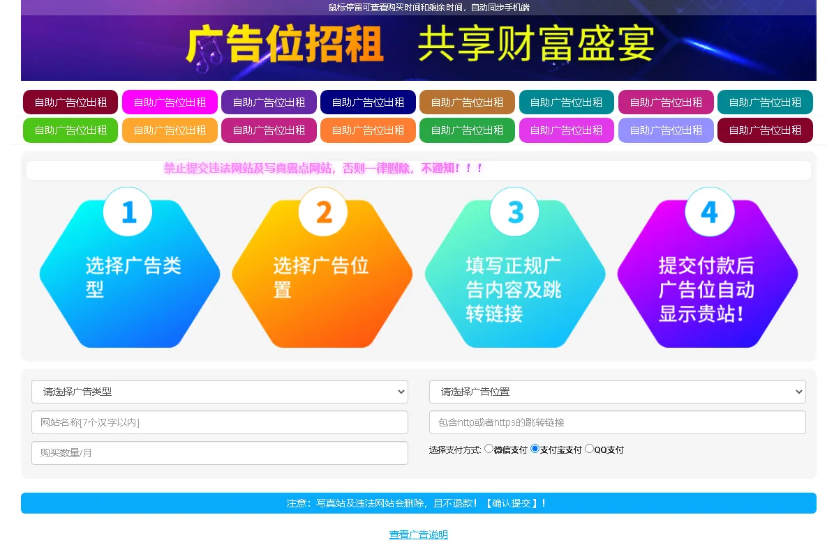 自助购买大横幅,小横幅,文字广告,后台可设置每个广告位的不同价格,颜色,宽高,自由增加修改广告位数量
